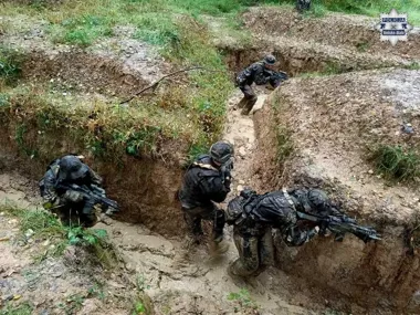 Ćwiczenia taktyczne w okopach - umundurowane grupy z replikami broni w Mikuszowicach