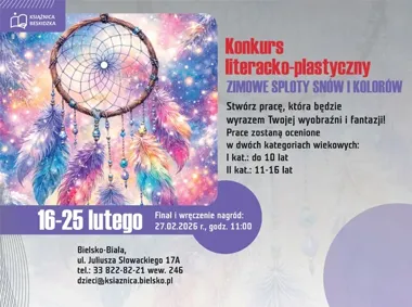 Książnica Beskidzka organizuje konkurs pod nazwą “Zimowe sploty snów i kolorów” - uczestnicy mogą przesyłać prace literackie albo plastyczne, pokazujące ich spojrzenie na zimę. Książnica czeka na zgłoszenia - termin nadsyłania prac to 25 lutego. Rozstrzygnięcie konkursu i wręczenie nagród odbędzie się 27 lutego o godz. 11:00. ❄️🏆