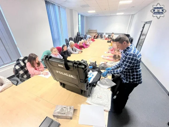 Komenda Miejska Policji w Bielsku-Białej gościła grupę 25 uczniów w wieku około 10 lat ze Szkoły Muzycznej w Bielsku-Białej. Policyjni profilaktycy - aspirant Monika Dziech oraz sierżant sztabowy Kamil Kumorek - przygotowali program obejmujący pokaz psów służbowych i prezentacje codziennych zadań funkcjonariuszy.