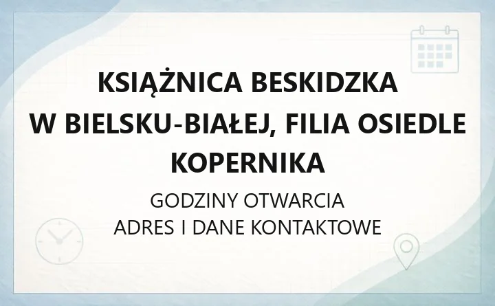 Filia Osiedle Kopernika jest jedną z placówek Książnicy Beskidzkiej w Bielsku-Białej. W sprawach godzin otwarcia, zapisów, usług filii i szczegółów dotyczących wypożyczeń prosimy kontaktować się z Biblioteką Główną Książnicy Beskidzkiej — to tam działa Centrum Informacji Bibliotecznej, które obsługuje zapisy i udziela informacji o wszystkich filiach.